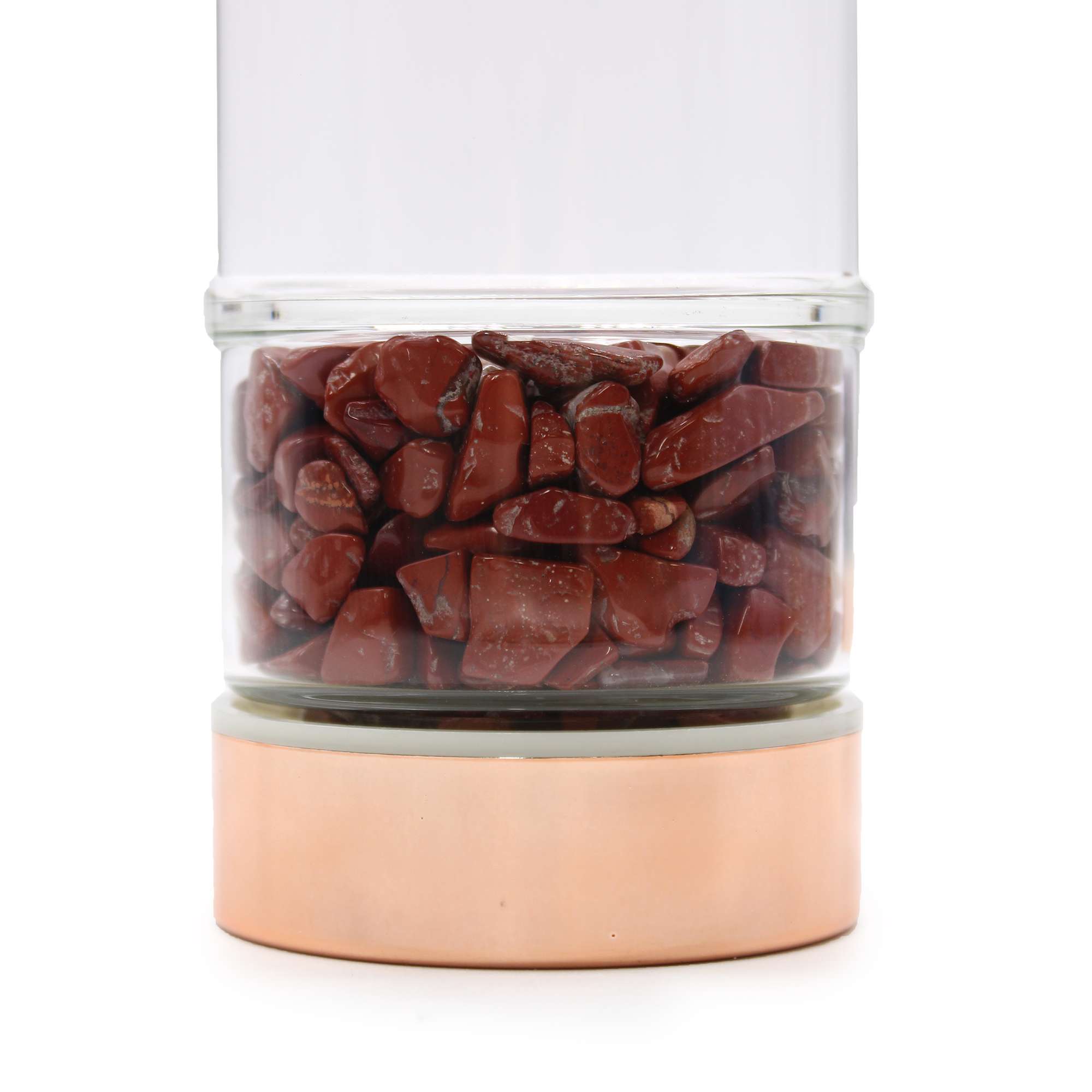 Esta botella infusora de cristal con detalles en oro rosa y piedras de jaspe rojo es mucho más que un recipiente: es una herramienta de energía y belleza para llevar tu té allí donde vayas.
