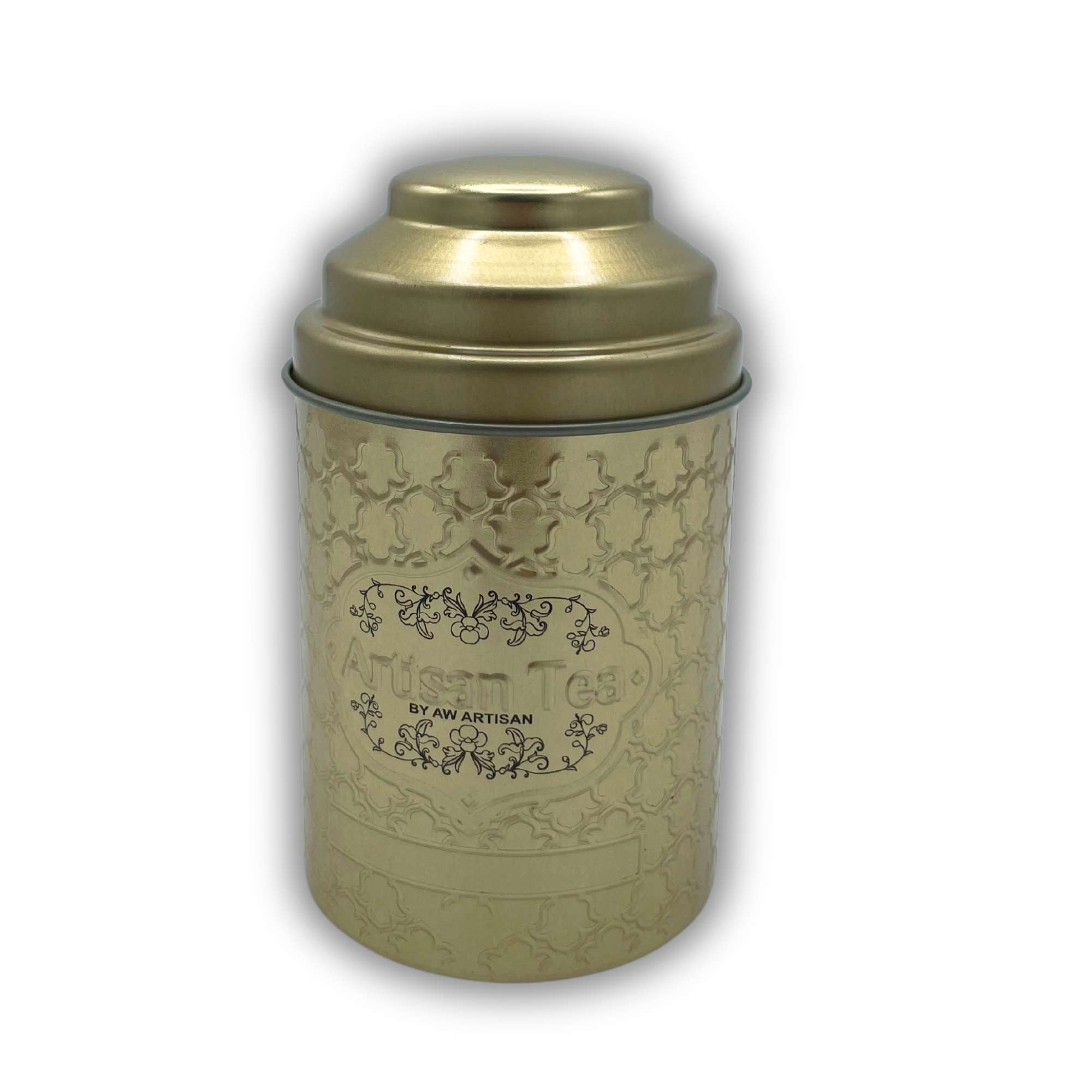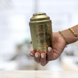 Esta lata dorada, con su tapa redonda abovedada, parece salida de una antigua botica de lujo o de la alacena de un alquimista que guardaba pócimas secretas. Su diseño, que combina elegancia y resistencia, es perfecto para custodiar tesoros aromáticos como infusiones, tés, velas, bálsamos o aceites esenciales.