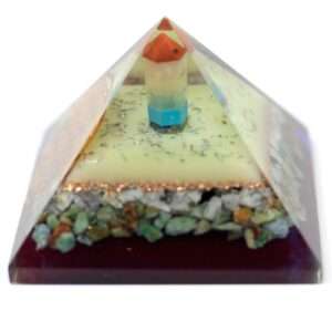 Dentro de la resina cristalina, se combinan metales, cobre y fragmentos de piedras semipreciosas que actúan como catalizadores de energía orgónica. La pirámide limpia y purifica los campos electromagnéticos, transformando las vibraciones densas en frecuencias más suaves y elevadas. Colocada sobre un escritorio, altar o mesita de noche, ayuda a restaurar el equilibrio natural del entorno, promueve la concentración, el descanso y la serenidad interior.