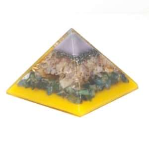 La Pirámide de Orgonita con Gemas Chakra y Árbol de la Vida (Base Oro) es una síntesis perfecta entre la energía ascendente del espíritu y la raíz profunda de la Tierra. En su interior late el pulso del universo: metales dorados, resina transparente y las siete gemas sagradas que representan los chakras se funden bajo la forma del Árbol de la Vida, símbolo ancestral de conexión, crecimiento y renovación perpetua.