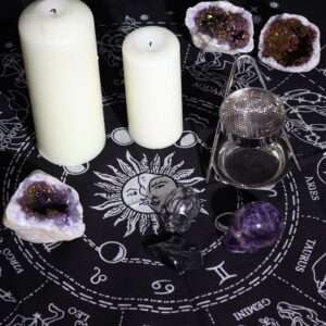 Descubre la magia del universo con nuestro mantel de altar esotérico adornado con el gráfico del horóscopo. Este elegante mantel, de 50×50 cm, no solo embellece cualquier altar, sino que también invita a la introspección y la conexión con las energías astrológicas. Ideal para rituales y meditaciones, permite a tus clientes alinear sus intenciones con los signos zodiacales y las energías cósmicas.