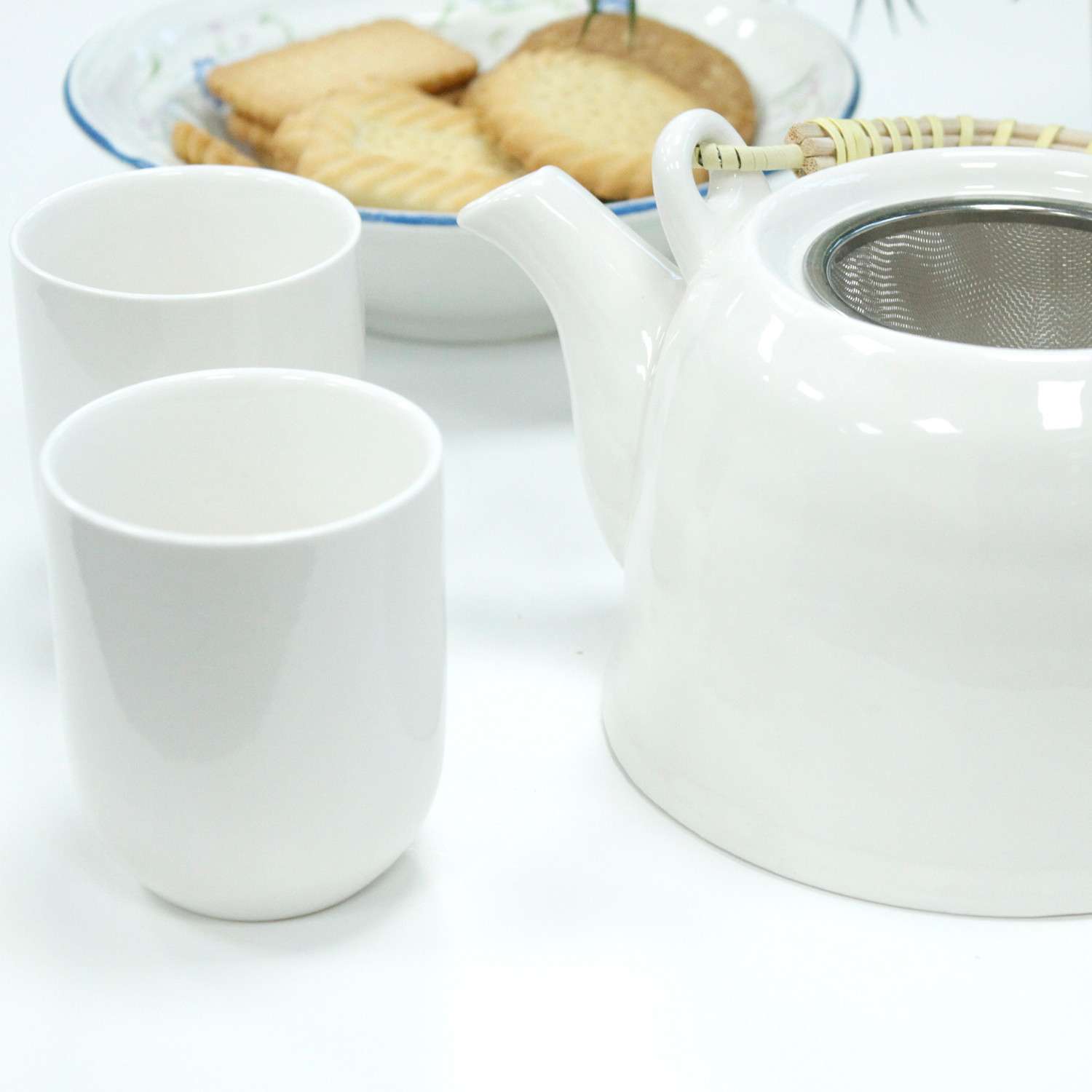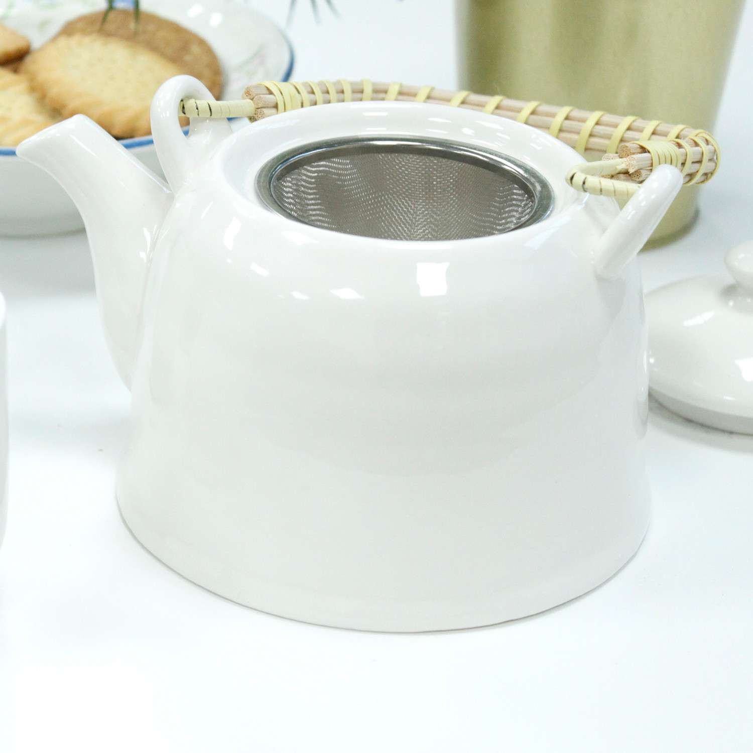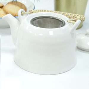 1 tetera cerámica esmaltada blanca con colador metálico