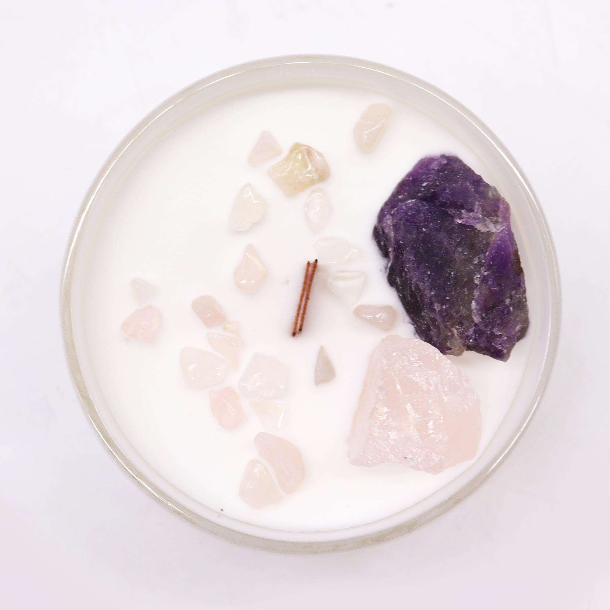 Nuestra vela del chakra del tercer ojo está fabricada con piedras preciosas reales, incluyendo amatista y cuarzo rosa, seleccionadas por sus propiedades energéticas.